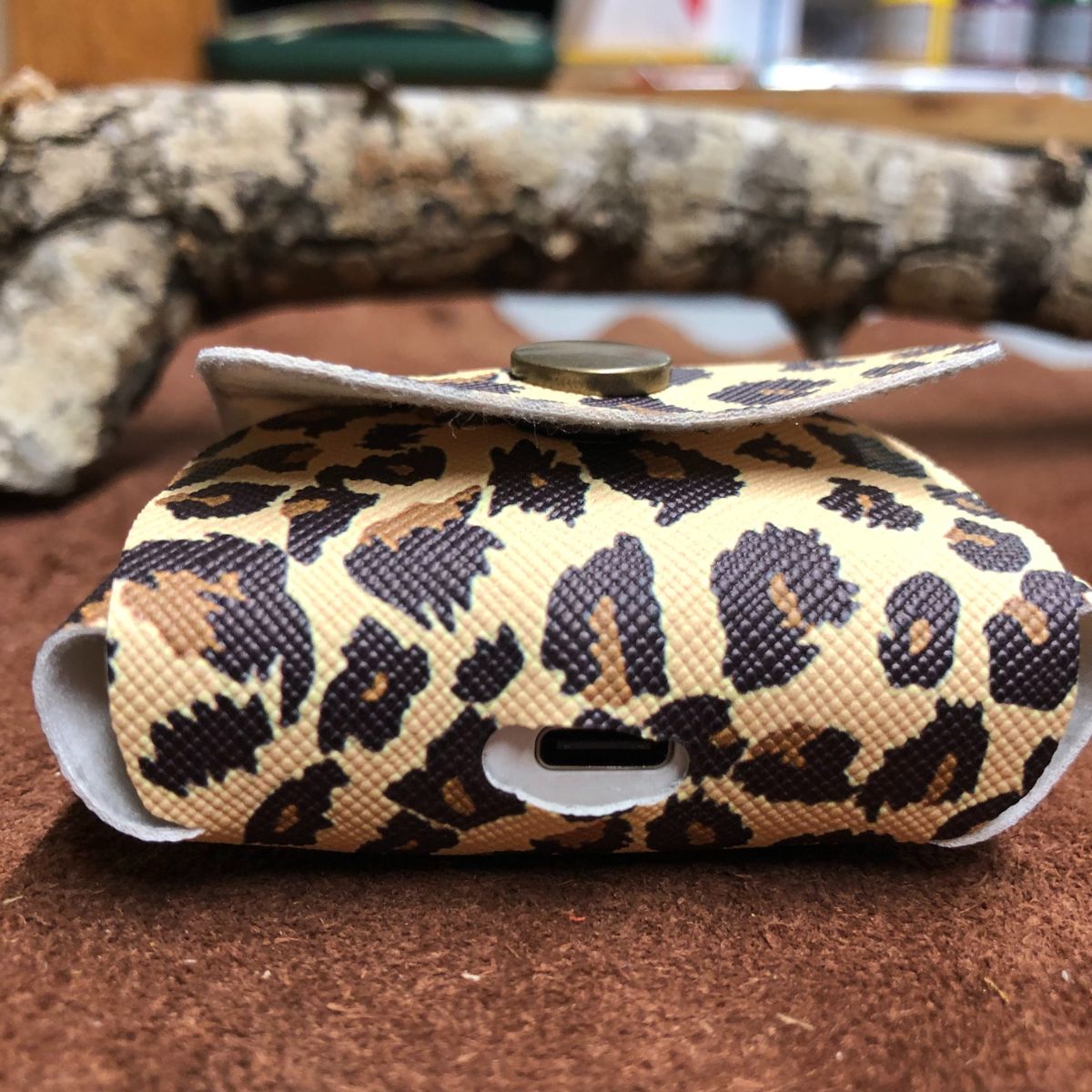 Faux leather in a leopard print, With a bronze snap and lobster clasp key ring. Case cover length 2 1/4 X 1 X 1 3/4 inches.