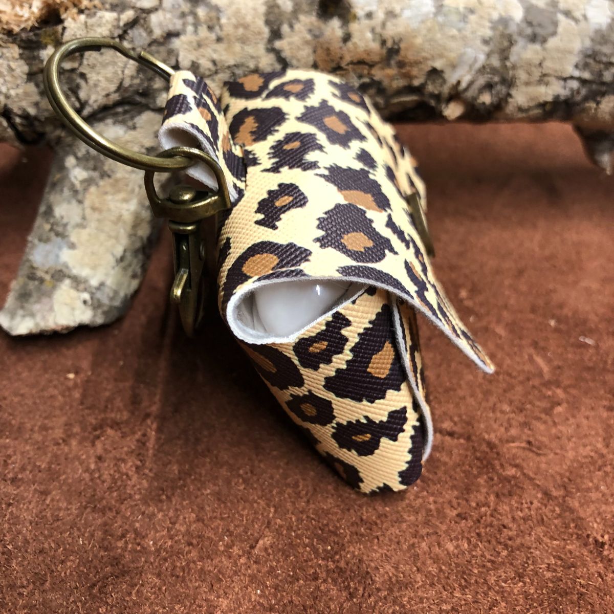 Faux leather, leopard print , squared top with bronze snap and lobster clasp keyring.
