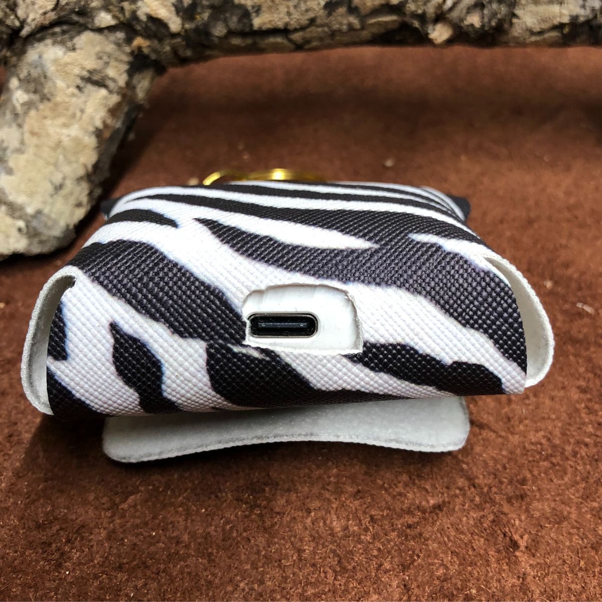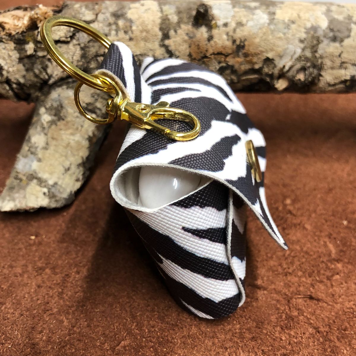 Faux leather, zebra print ,  squared top with gold snap and lobster clasp keyring.