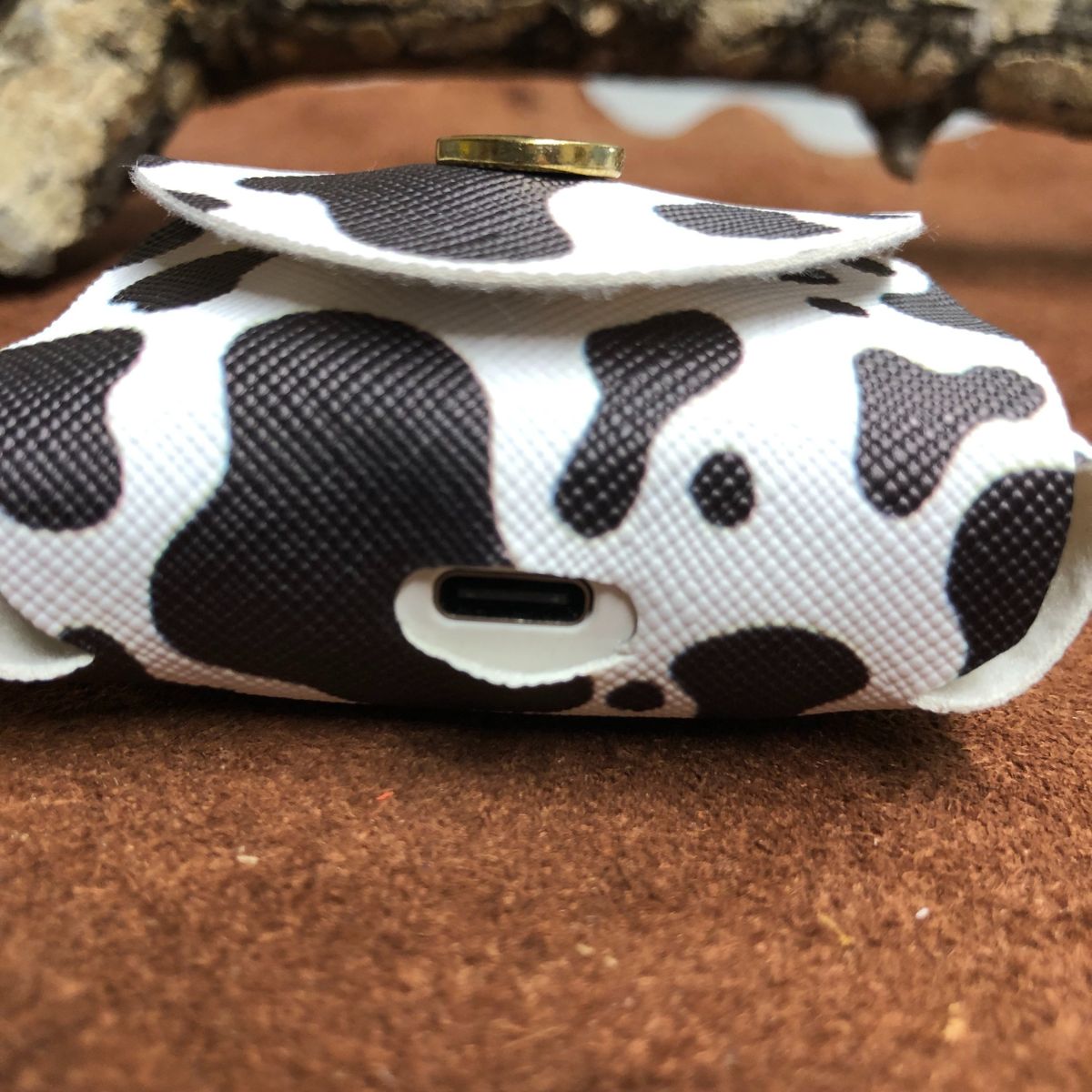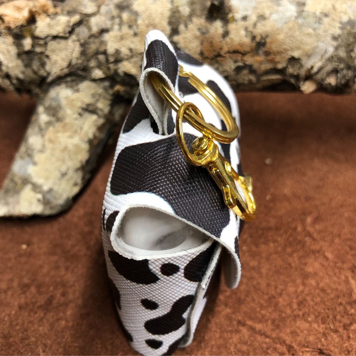 Faux leather, cow print ,  rounded top with gold snap and lobster clasp keyring.