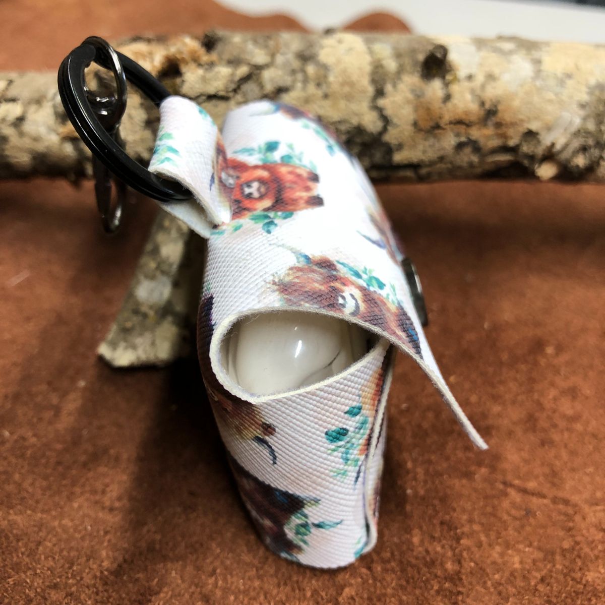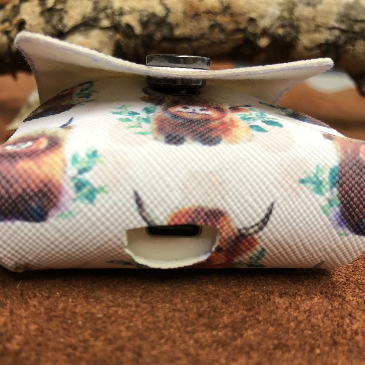 Faux leather, Highland cows, titanium black snap and lobster clasp key ring. Case cover length 2 1/4 X 1 X 1 3/4 inches.
