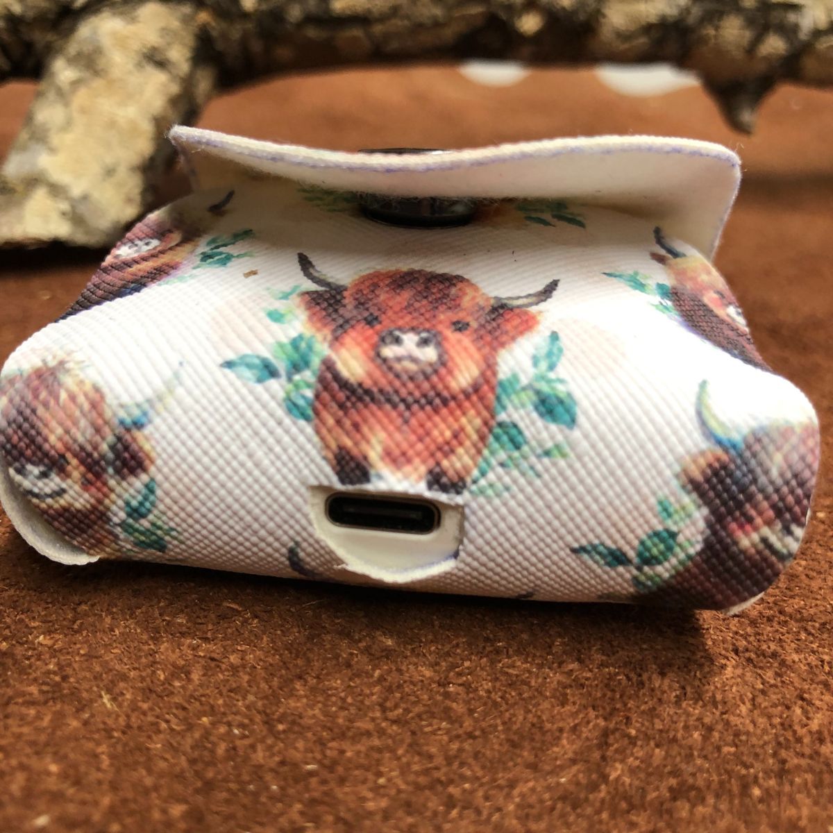 Faux leather, Highland cows, titanium black snap and lobster clasp key ring. Case cover length 2 1/4 X 1 X 1 3/4 inches.