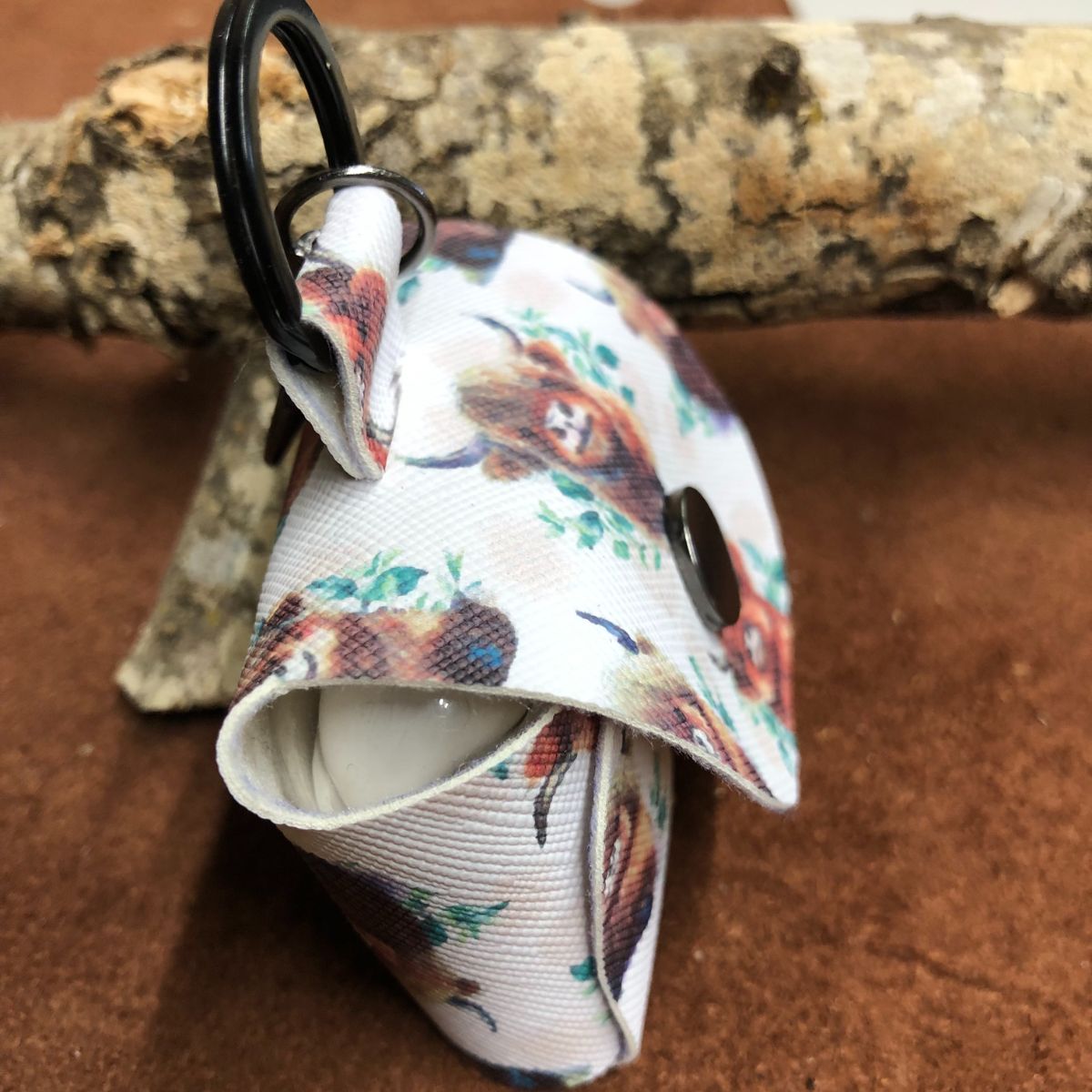 Faux leather, Highland cows, rounded top with titanium black snap and lobster clasp keyring.