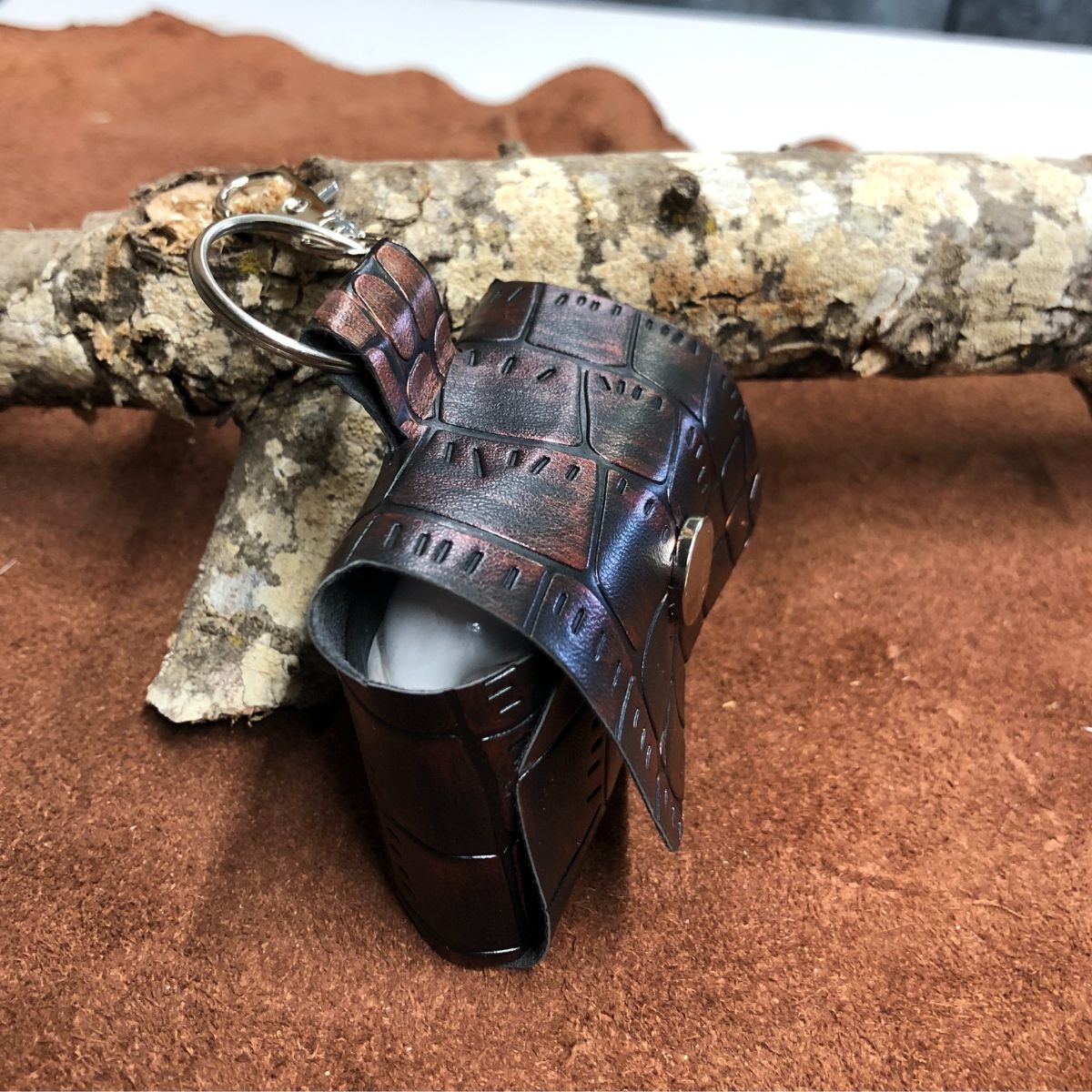 Faux crocodile leather in a Shimmering Burgundy color, With a Silver snap and lobster clasp key ring. Case cover length 2 1/4 X 1 X 1 3/4 inches.