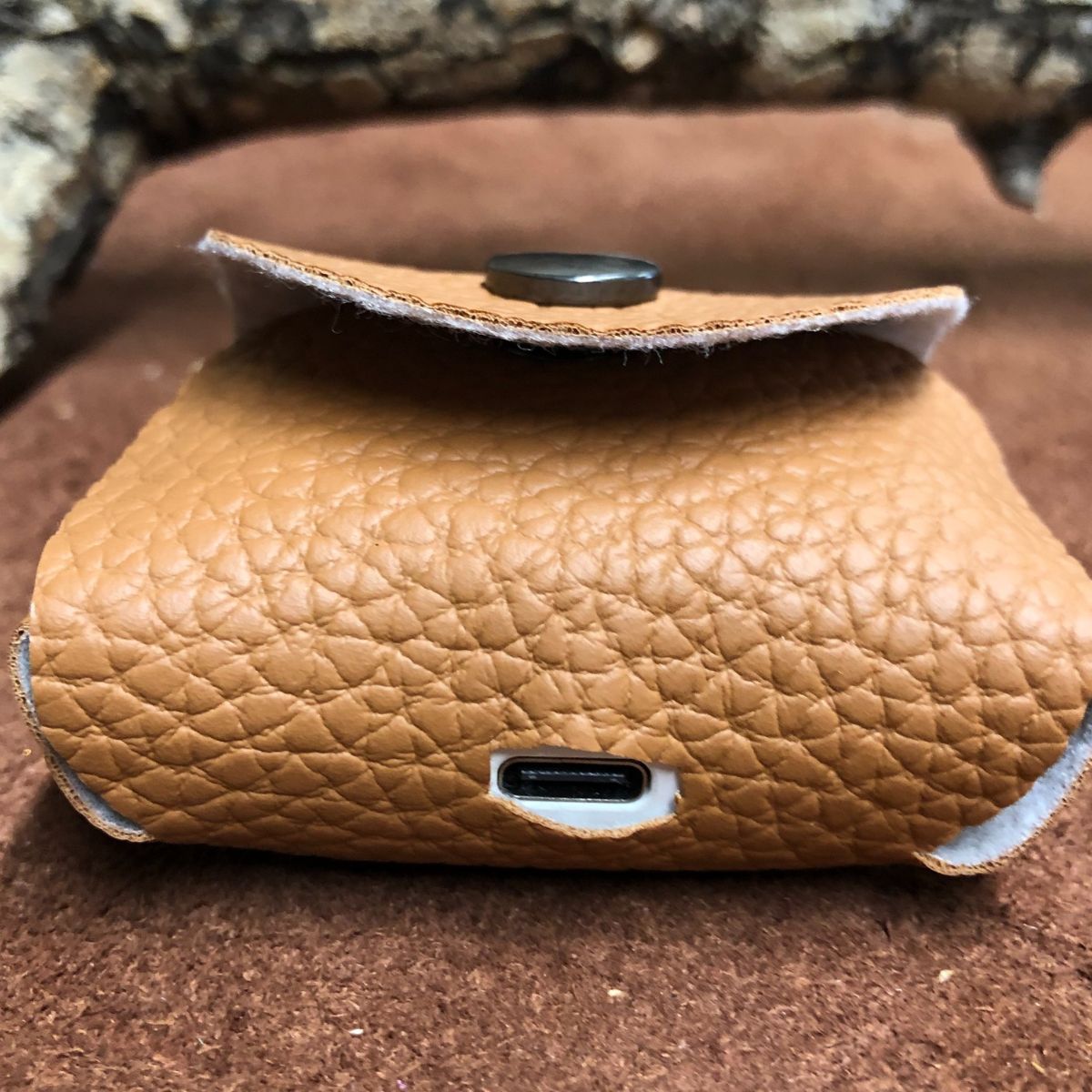 Faux leather, Pebbled tan, titanium black snap and lobster clasp key ring. Case cover length 2 1/4 X 1 X 1 3/4 inches.