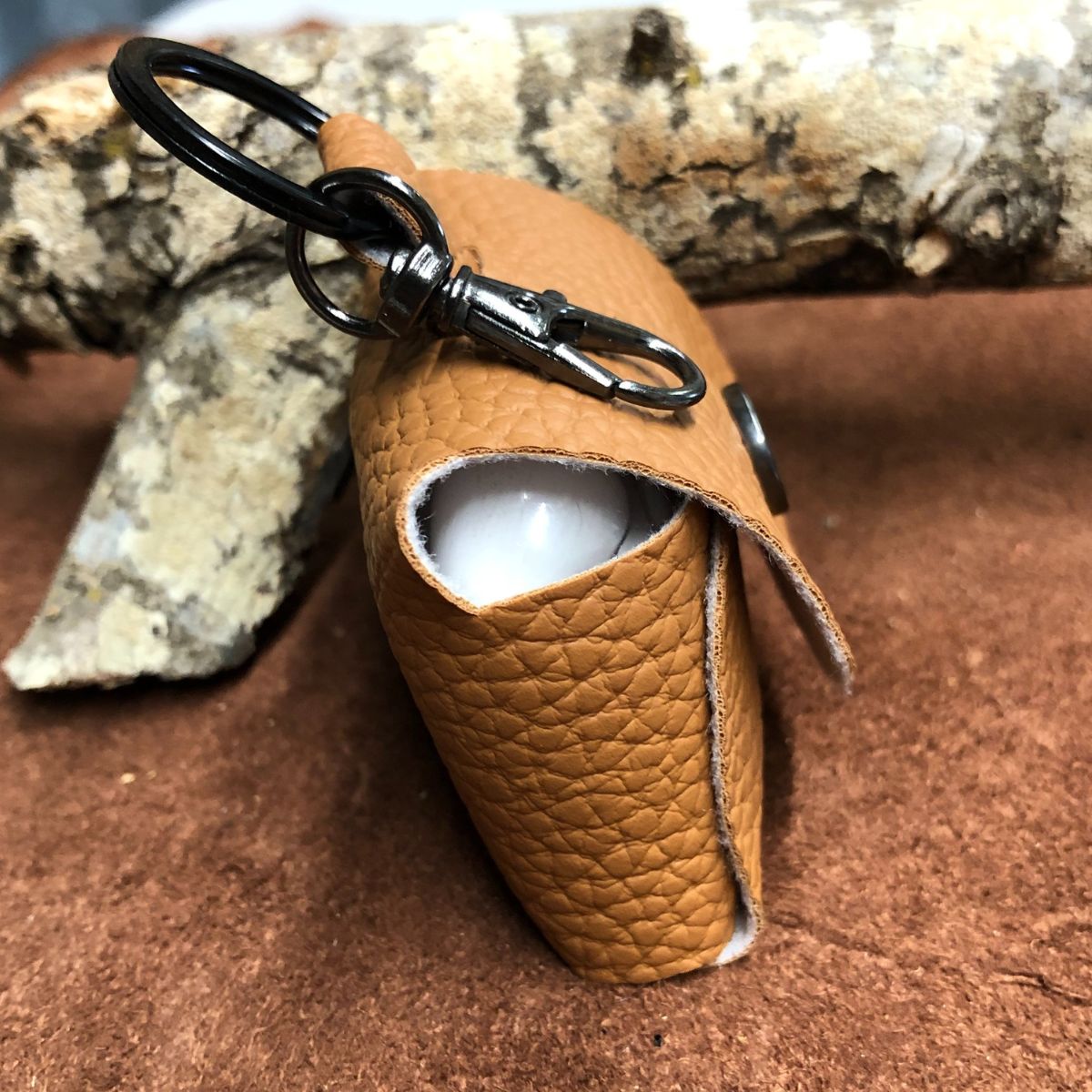 Faux leather, pebbled tan,  rounded top with titanium black snap and lobster clasp keyring.