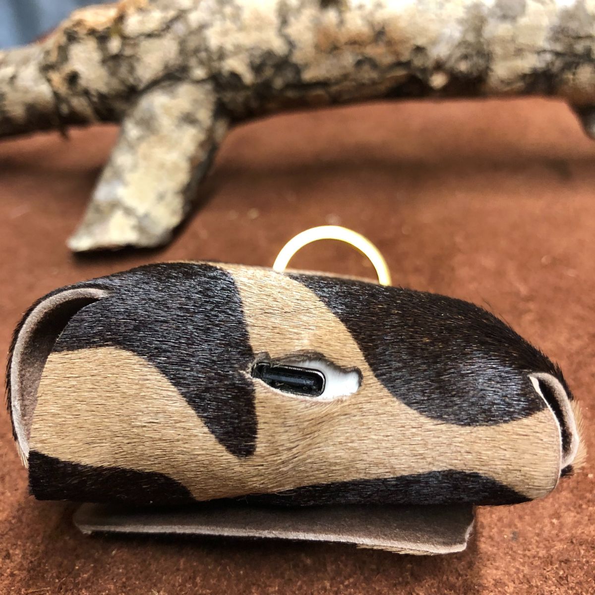 Real leather, Giraffe print on kidskin hair on hide, gold snap and lobster clasp key ring. Case cover length 2 1/4 X 1 X 1 3/4 inches.
