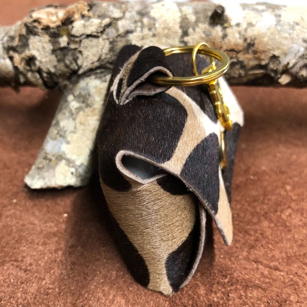 Real leather, Giraffe print on kidskin hair on hide, squared top with gold snap and lobster clasp keyring.