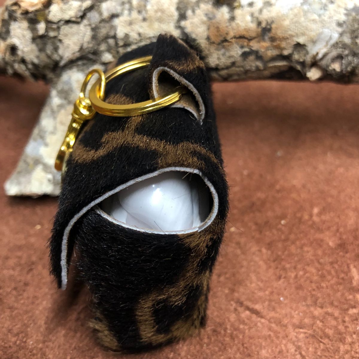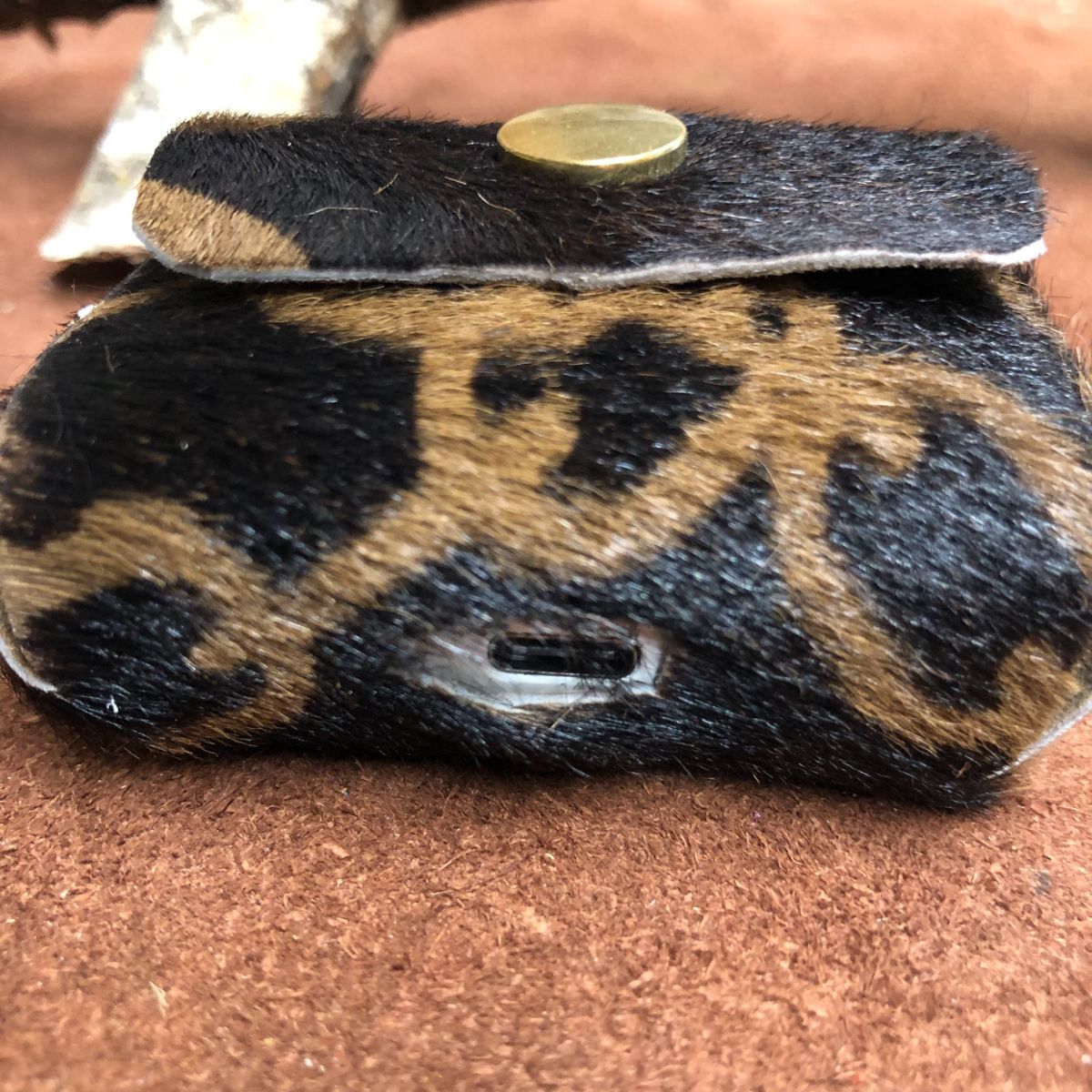 Real leather, Chain print on kidskin hair on hide, squared top with gold snap and lobster clasp keyring.