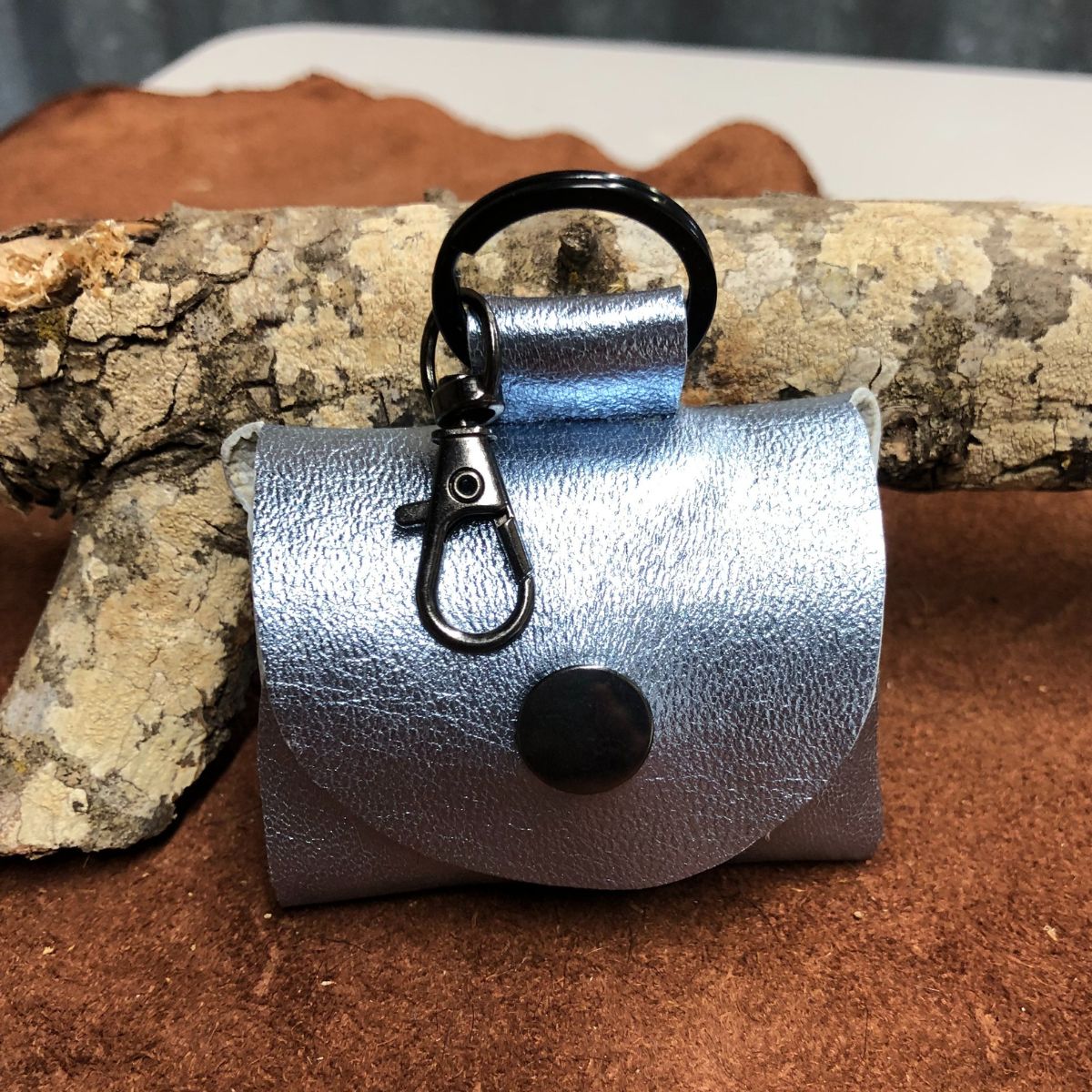 Real leather, Silvery blue print on kidskin,  rounded top with titanium black snap and lobster clasp keyring.
