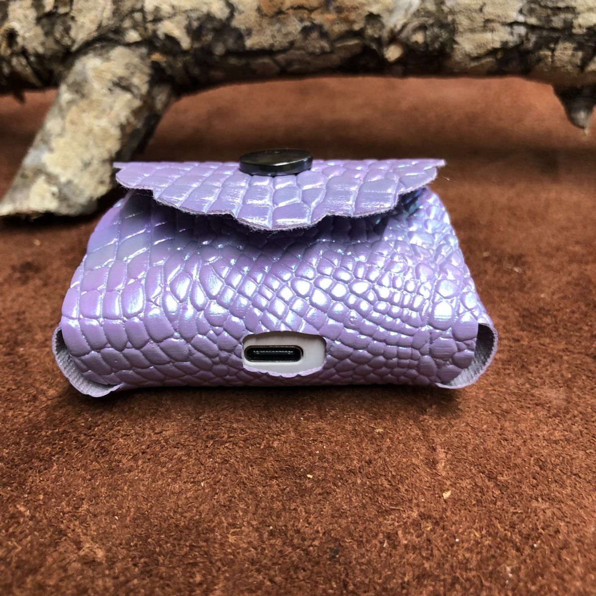Faux crocodile leather in a Shimmering Violet color, With a Titanium Black snap and lobster clasp key ring. Case cover length 2 1/4 X 1 X 1 3/4 inches.