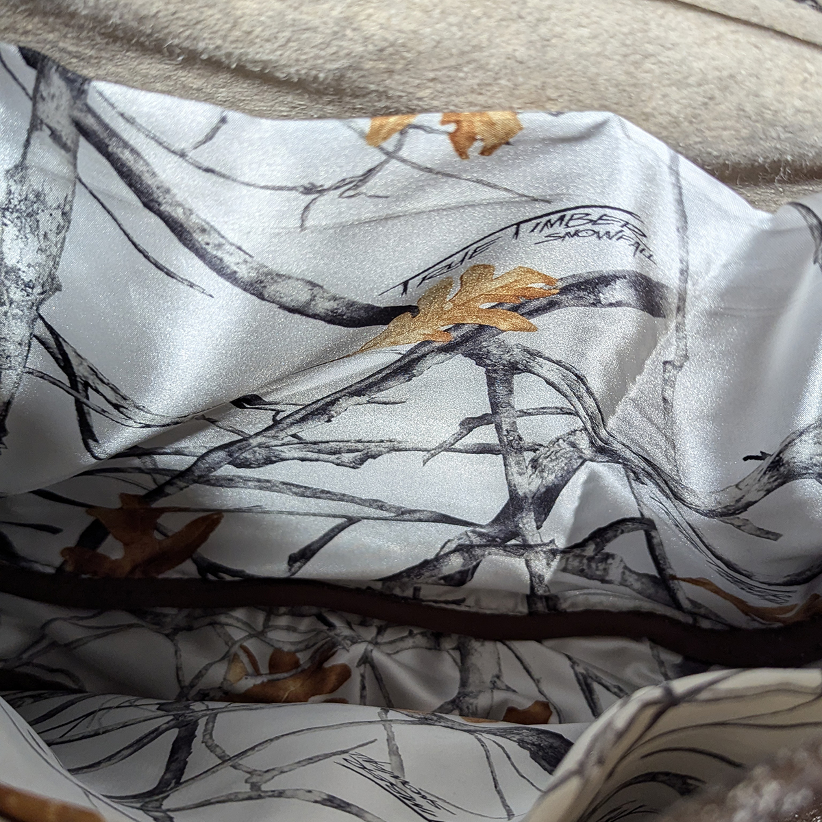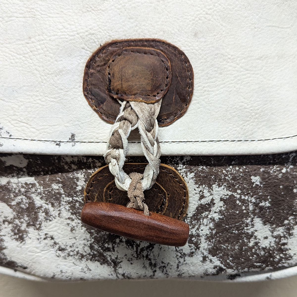 Beautiful brown and white raw hide leather handbag with braided leather and wood closure. Lined in a woodland fabric with inside pockets. Drop 19.5" - Body 14.5" wide, 13" high, 3' deep.