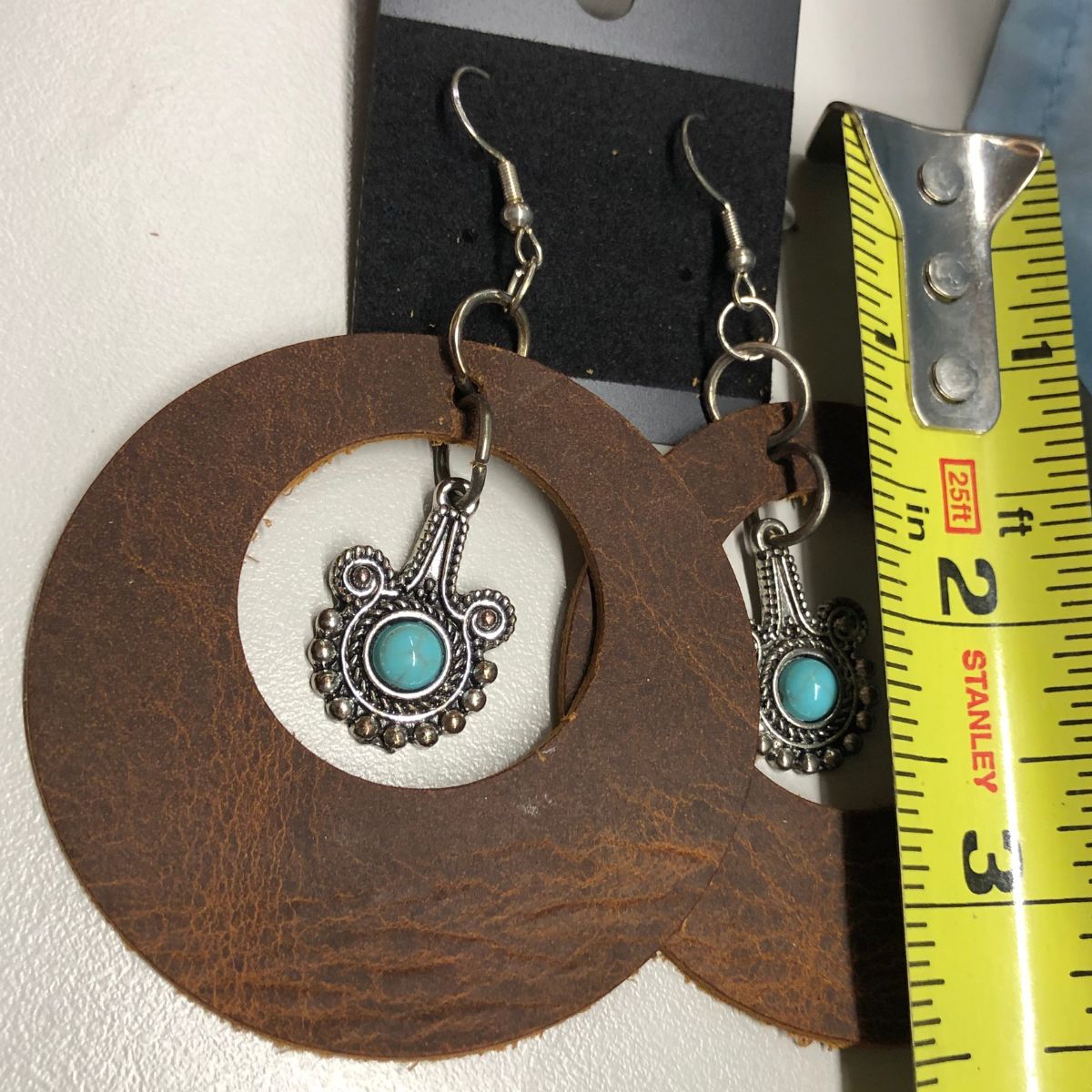 Real Distressed Leather Wide Circle Cutout Earrings with Faux Turquoise & Silver Sitar Charms on Silver ear wires.