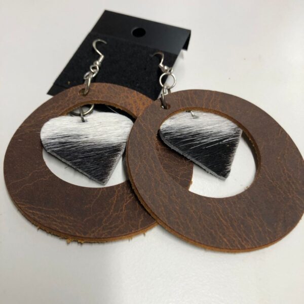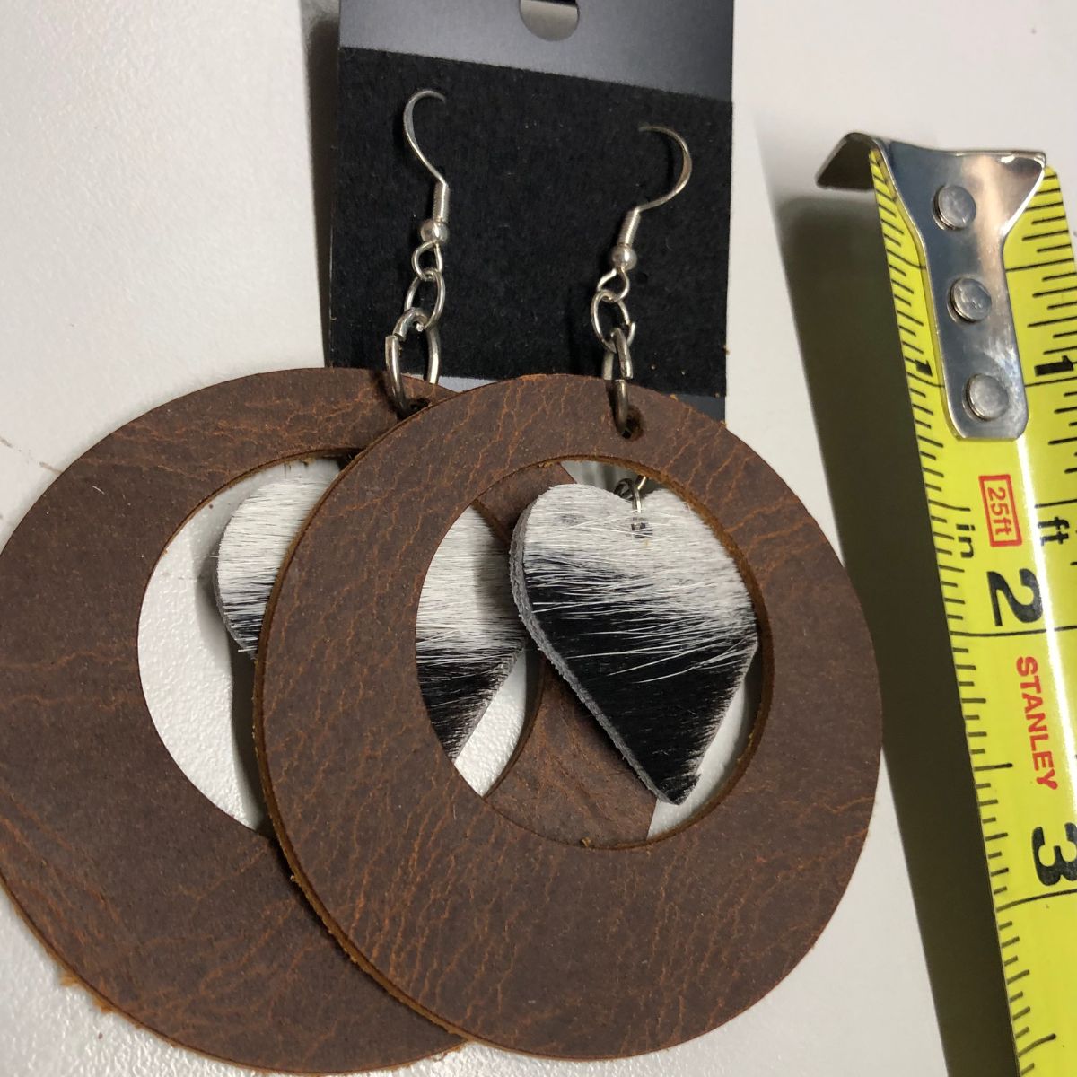 Real Distressed Leather Wide Circle Cutout Earrings and Real Cowhide Heart Charms on Silver Ear wires.