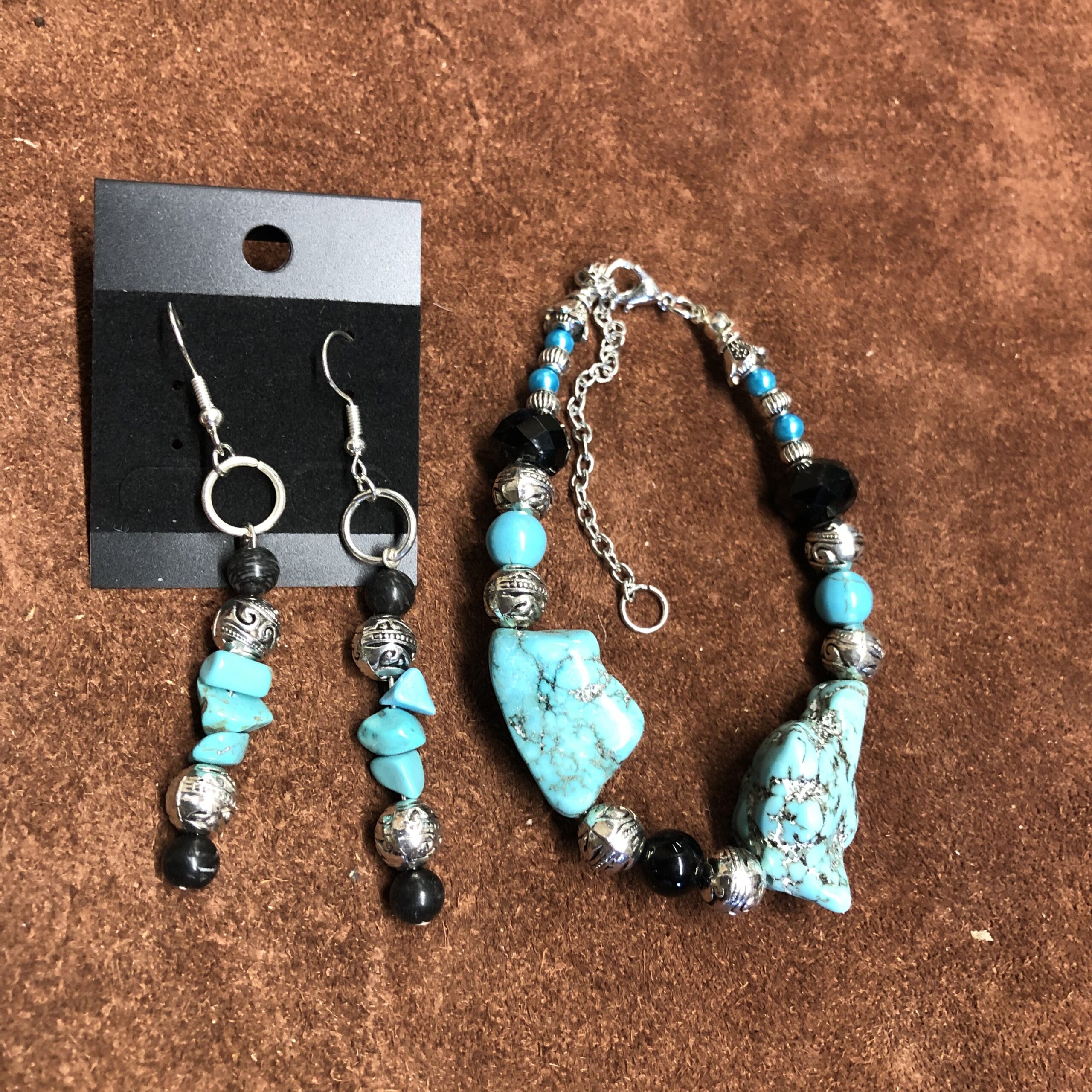 Magnasite Nugget Bracelet with Silver & Black Accents and Real Turquoise Nugget Earrings.