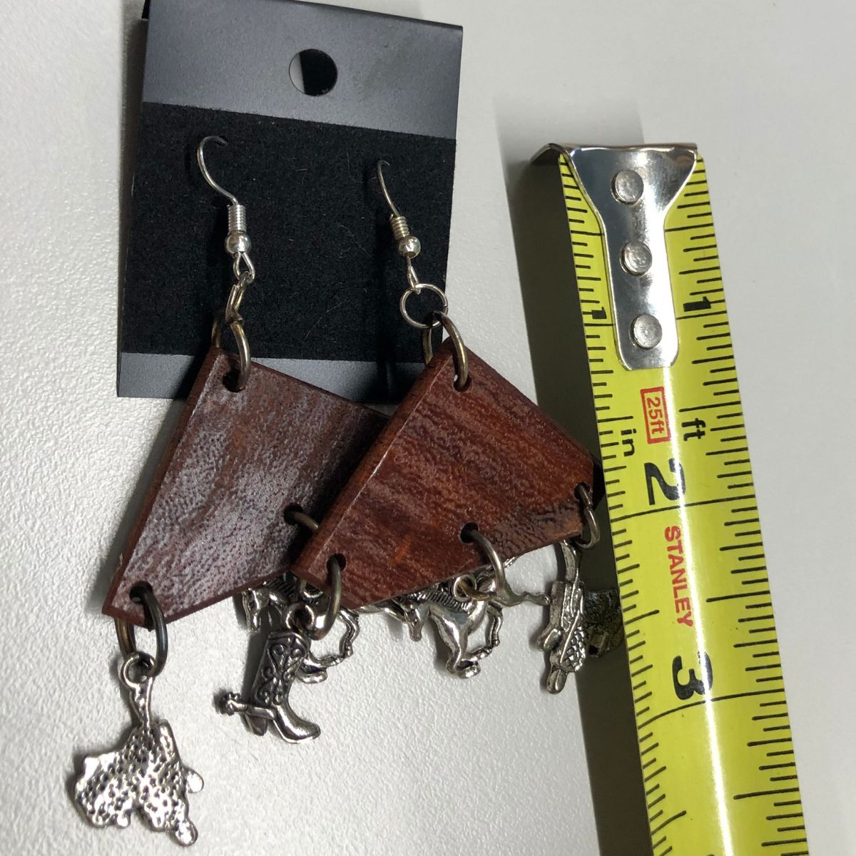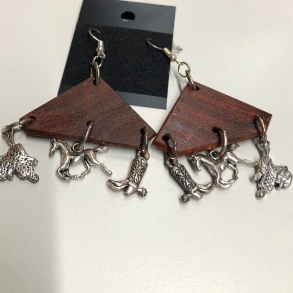 Mesquite wood with silver tone Western charms and silver tone ear wires. Earring length 3 inches