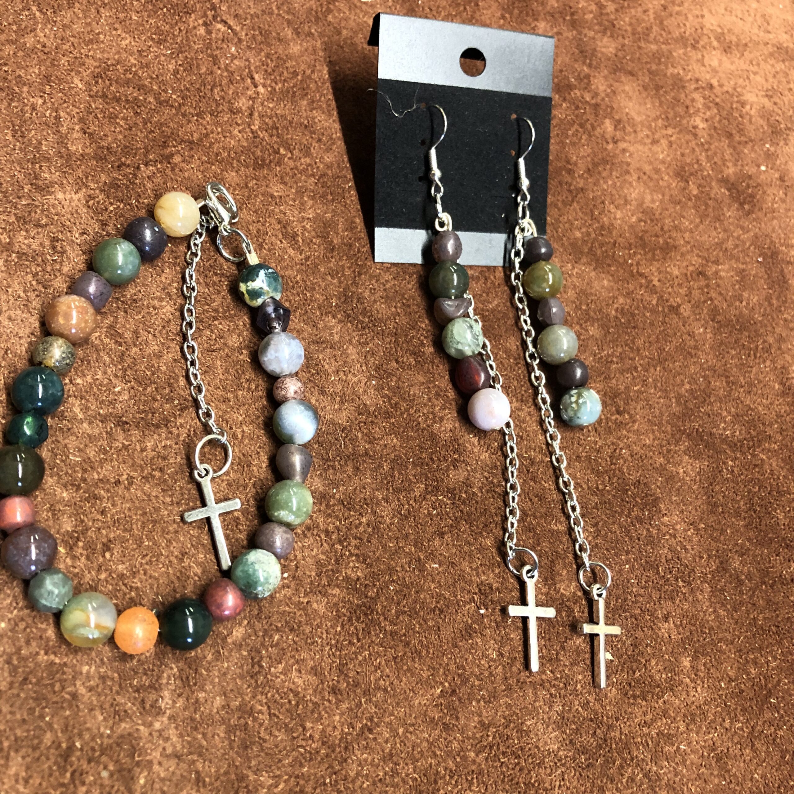 Multicolored Beaded Bracelet and Earrings with Silver Cross Charms.