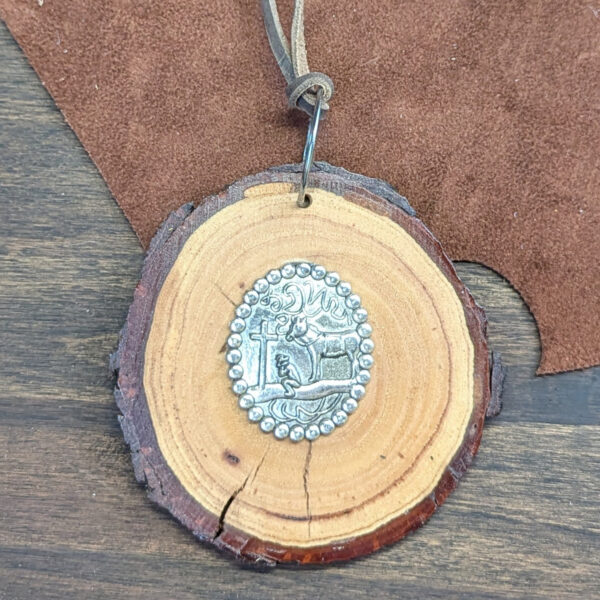 Pecan wood round with praying cowboy, horse and cross concho with brown leather cord. Leather cord length for hanging is 11.5, pecan medallion is 4 inches. total length is 16 inches