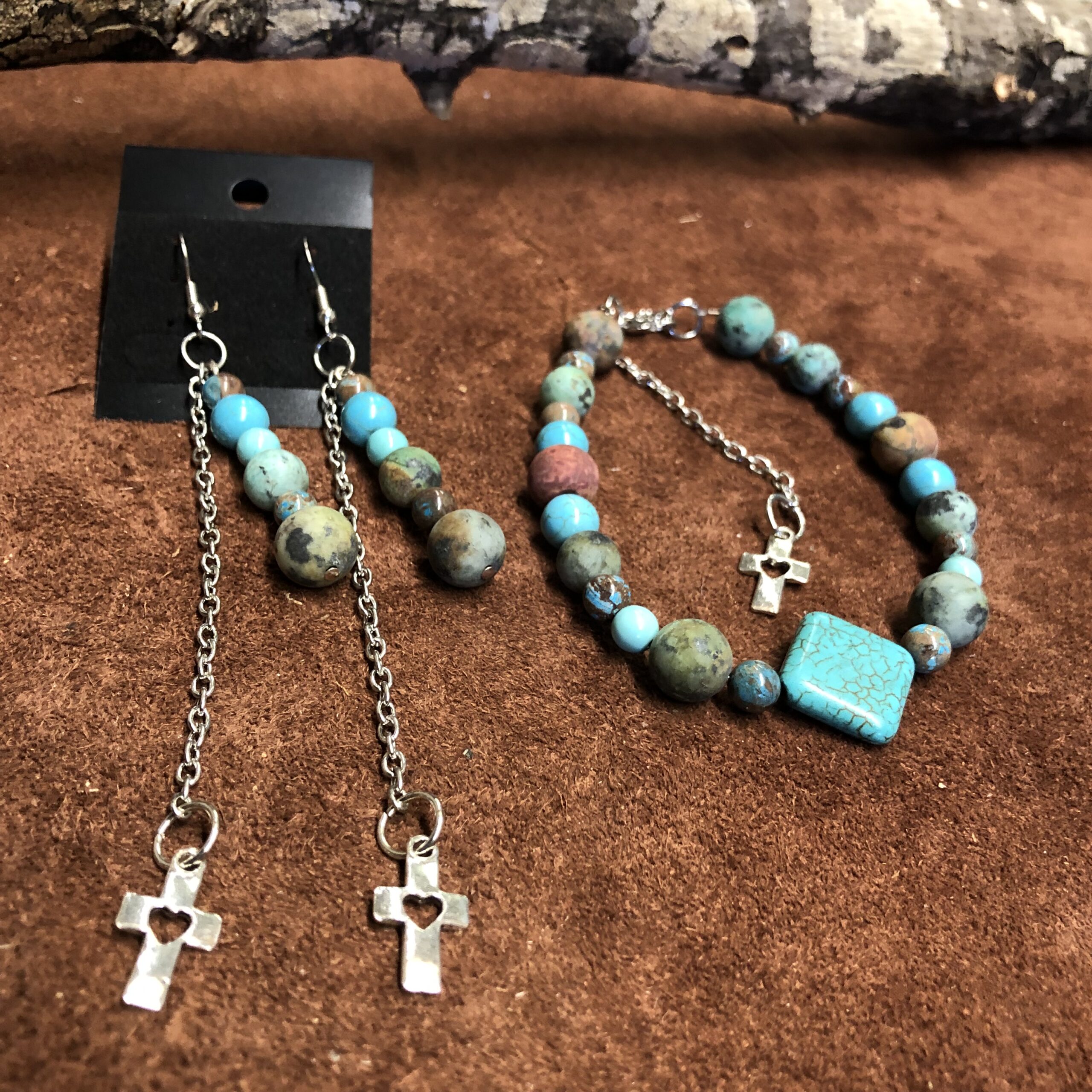 Picasso Jasper in Blue with Magnasite Diamond Shaped Bead Bracelet and Earrings with Silver Heart Cross Charm.