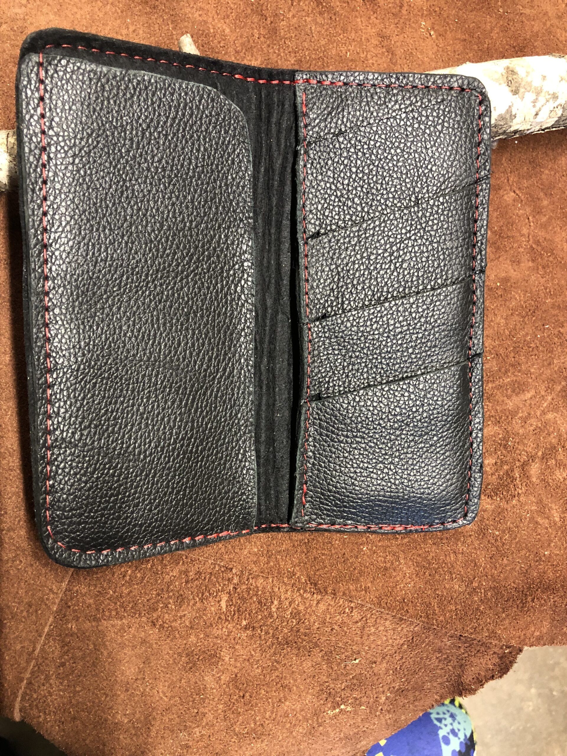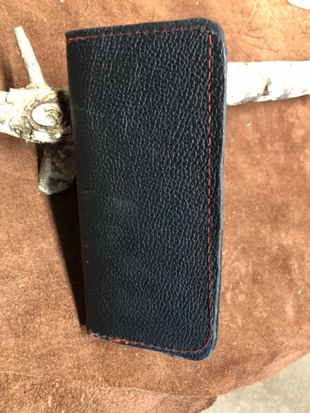 Real Black Pebbled Leather Wallet. Real Leather with Red Stitching. 7" long - 3 1/2" wide, Inside- has 3 slots for cards.