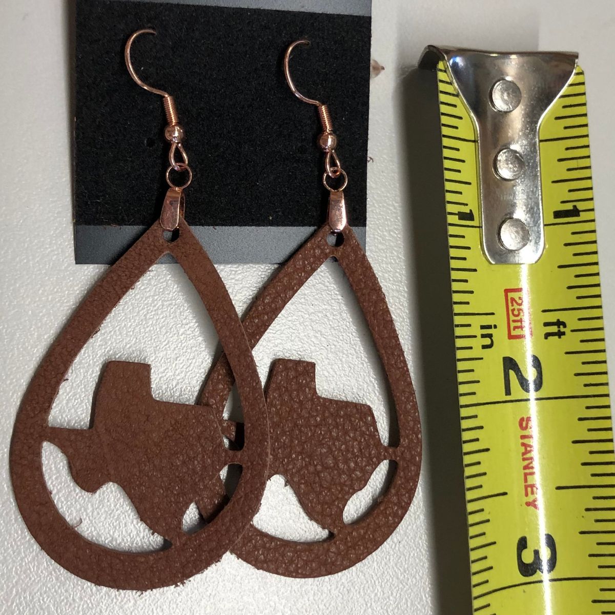 Real Brown Pebbled Leather Texas Teardrop Earrings with Rose Gold Ear Wires. Earring length - 3 inches
