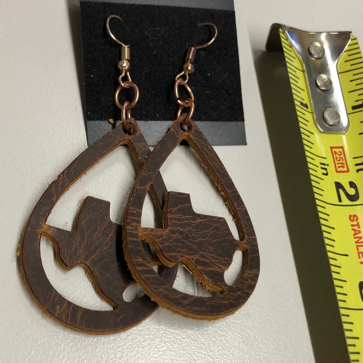 Real Distressed Leather Earrings with Texas Teardrop cutouts in the center on Rose Gold Ear wires.