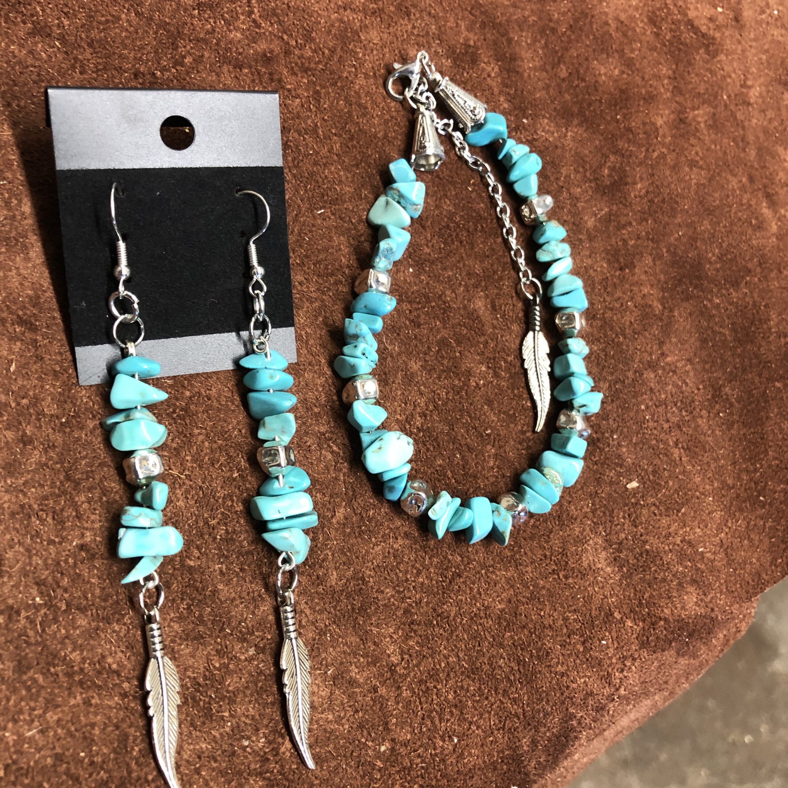 Real Turquoise Nuggets with Silver Nugget Beads and Silver Feather Charms Bracelet and Earrings. Bracelet - 4 inches long, Earrings - 4 inches long.
