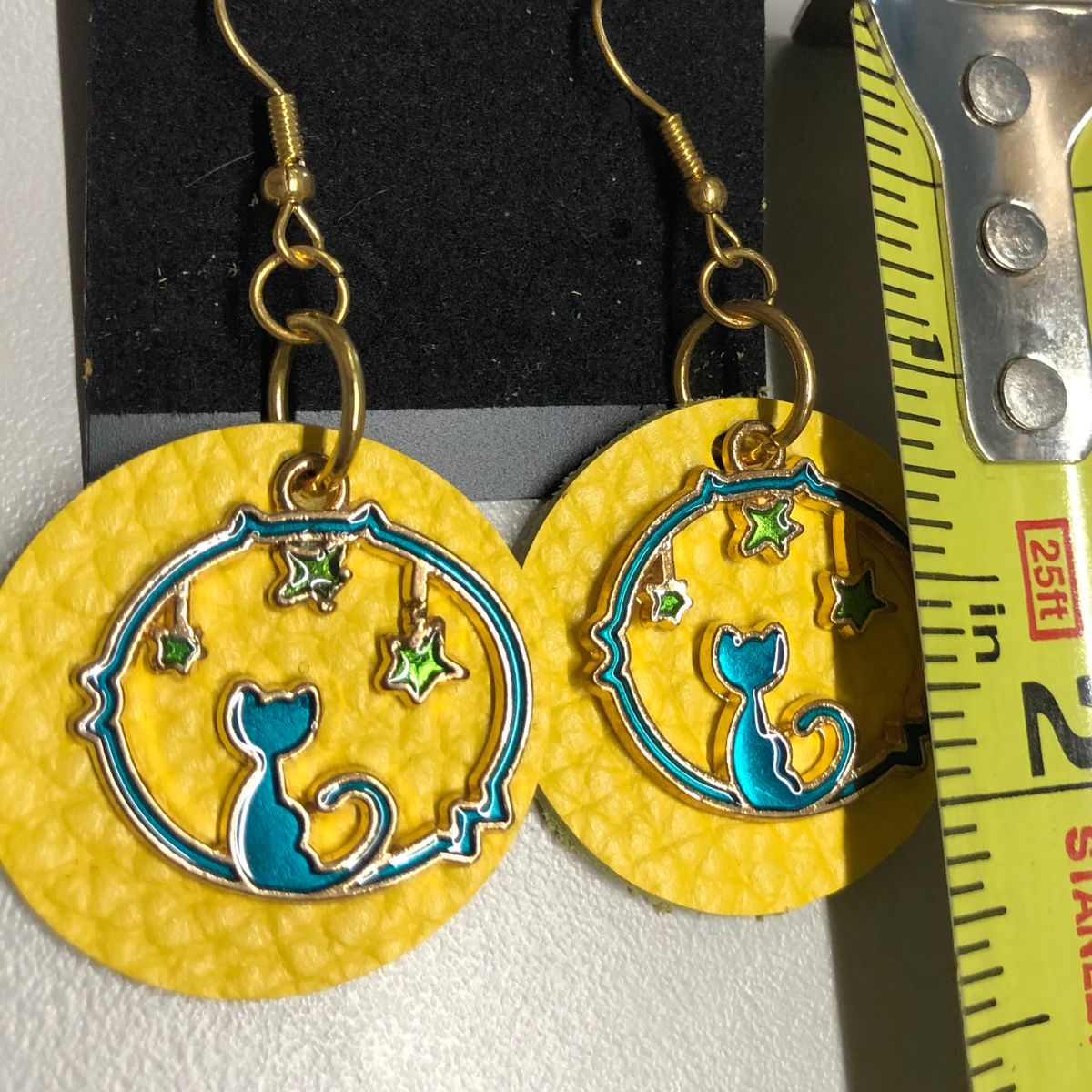 Real Yellow Pebbled Leather with gold tone earring wires and Blue Enameled Cat Under Stars Charms. Earring length: 2.5 inches