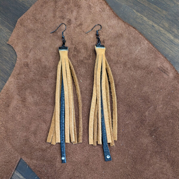 Tan leather fringe & single black leather fringe with rhinestone accent with black wire earrings. Earring length 6 inches