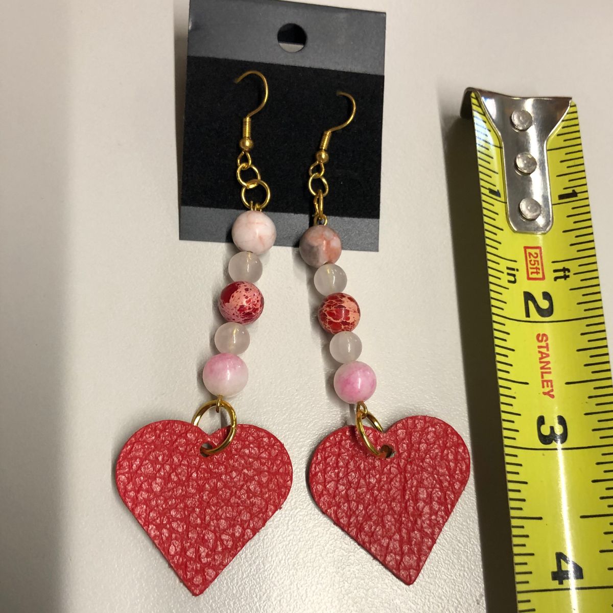 Various Sea Coral Bead Earrings with Real Red Pebbled Leather Heart Charms with Gold Ear Wires. Earring length - 4 inches
