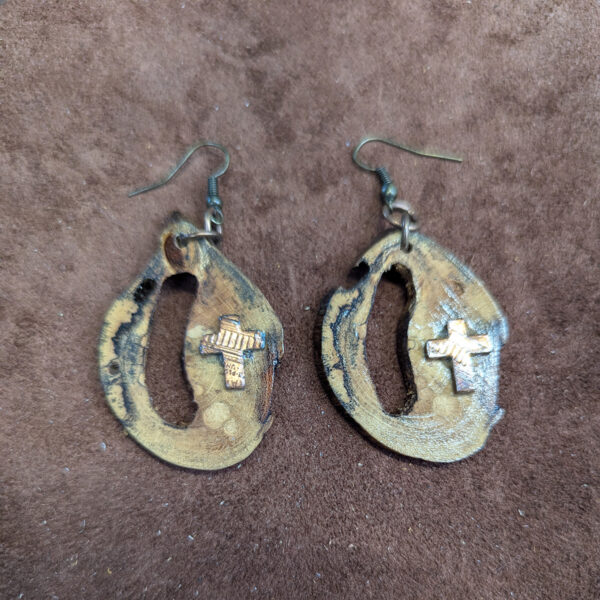 Weathered mesquite with natural cutout and copper penny cross with copper tone ear wires. Earring size 2.75 inches long